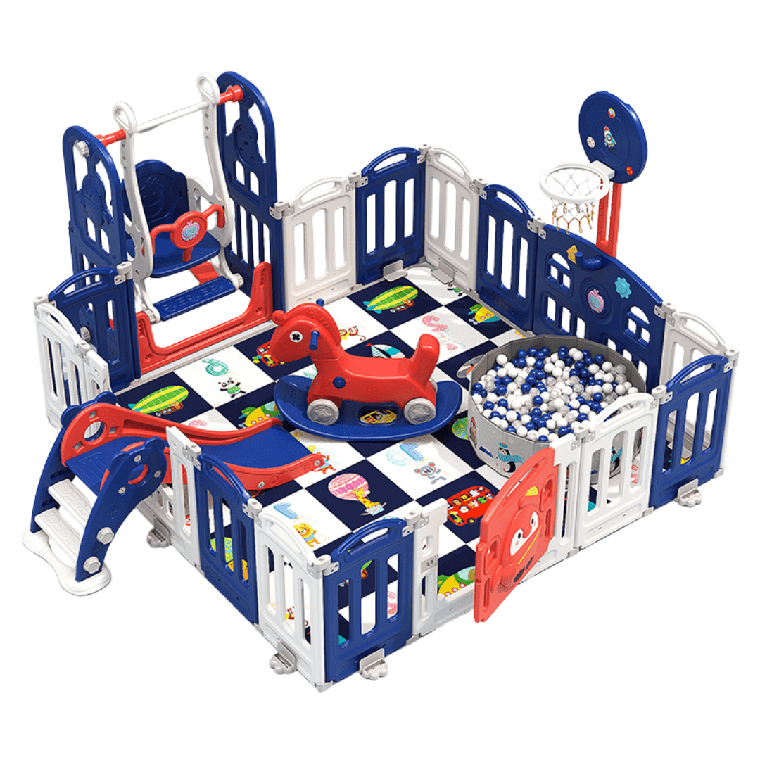 El Corral Multijuegos Pingüino es un verdadero centro de diversión y desarrollo para los más pequeños. Este completo set incluye 12 paneles, 1 puerta abatible, 1 panel didáctico, 1 columpio musical, 1 tobogán, 1 piscina plegable, 1 aro de básquet, 1 organizador, 1 balancín 2 en 1 carrito y 1 alfombra.